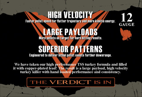 Designed using Verdict’s high-performance TSS formula as its foundation, the Juror #5 replaces tungsten with a heavy copper-plated lead payload—giving hunters a more affordable option without sacrificing punch. The result is a large payload, high velocity turkey load with hand loaded consistency and performance.